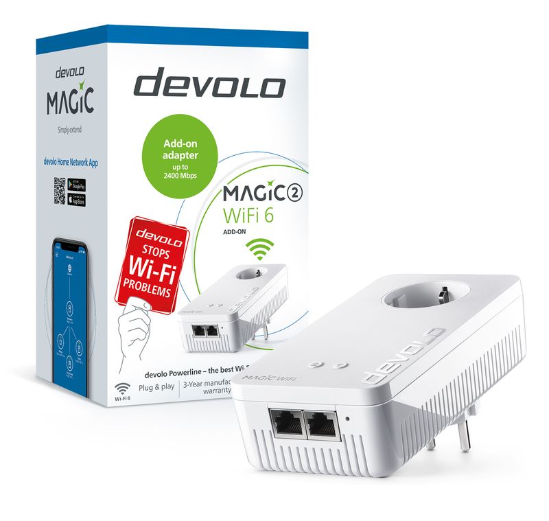 Οι συγκεκριμένες βελτιώσεις στην άνεση και στην απόδοση περιλαμβάνονται στη διακριτική σχεδίαση των προσαρμογέων Magic 2 WiFi 6. Αυτοί οι υπερσύγχρονοι προσαρμογείς απλώς συνδέονται στις πρίζες και αξιοποιούν το υπάρχον ηλεκτρικό δίκτυο, για να στείλουν το σήμα του Internet με μέγιστη ταχύτητα, με έως 2.400 Mbps, σε οποιοδήποτε σημείο του σπιτιού χρειάζεται. Το μεγάλο πλεονέκτημα της τεχνολογίας Powerline είναι ότι καταφέρνει και ξεπερνά σημαντικά εμπόδια, όπως οροφές, τοίχους, έπιπλα ή ακόμα και συστήματα θέρμανσης δαπέδου, τα οποία έχουν την τάση να μπλοκάρουν το WiFi.