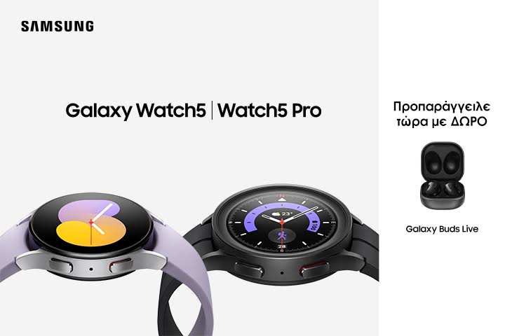 Οι καταναλωτές μπορούν να προ-παραγγείλουν επίσης, το νέο SAMSUNG Galaxy Watch5|Watch5 Pro, από 299,90€ και σε 12 άτοκες δόσεις που καλύπτει τις καθημερινές ανάγκες του χρήστη, από την άθληση μέχρι τον ύπνο και την παρακολούθηση των καρδιακών παλμών, ενθαρρύνοντας έναν πιο υγιή τρόπο ζωής. Προ-παραγγέλνοντας το νέο smartwatch της SAMSUNG, οι καταναλωτές παίρνουν δώρο τα SAMSUNG Galaxy Buds Live, στο χρώμα της επιλογής τους, μέσω της εφαρμογής SAMSUNG Members.