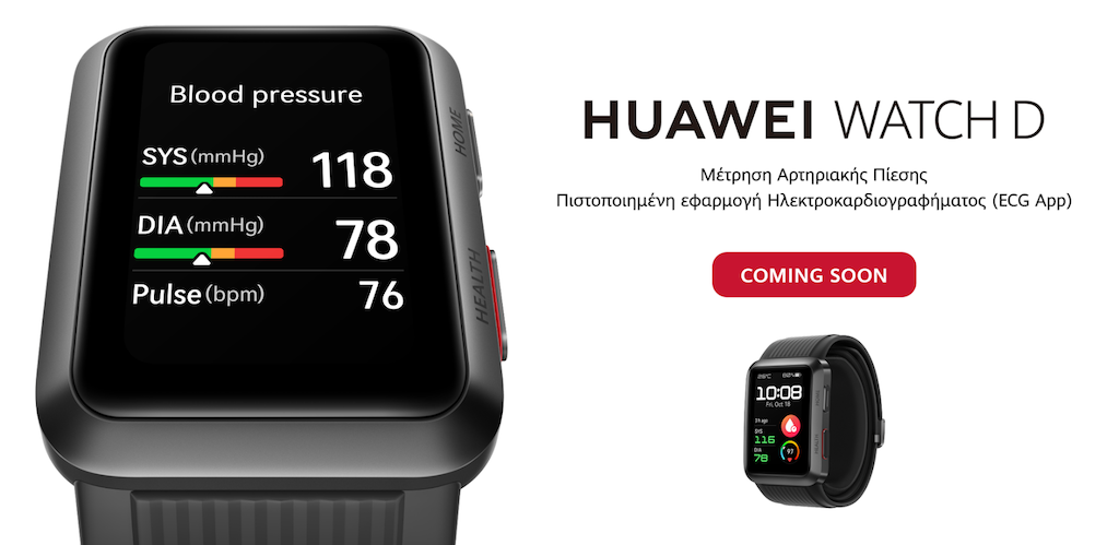 Το πραγματικό smartwatch πιεσόμετρο HUAWEI WATCH D, για παρακολούθηση αρτηριακής πίεσης, αλλά και ηλεκτροκαρδιογραφήματος (ECG), με πιστοποίηση από την Ευρωπαϊκή Ένωση, έρχεται και στην Ελλάδα από την Huawei.