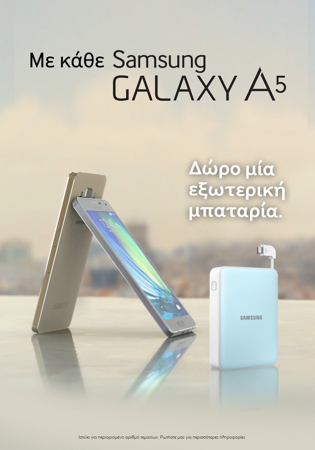 Η Samsung Electronics Hellas δίνει τη δυνατότητα σε όλους όσους αγόρασαν τα νέα smartphones Galaxy A3 και Galaxy A5, να διεκδικήσουν εκπληκτικά δώρα για τις καινούριες συσκευές τους. Όσοι έχουν αγοράσει το Samsung Galaxy A5 μετά τις 11 Μαρτίου, μπορούν να αποκτήσουν δωρεάν μια εξωτερική μπαταρία, ώστε να απολαμβάνουν το αγαπημένο τους smartphone για ακόμα περισσότερη ώρα.