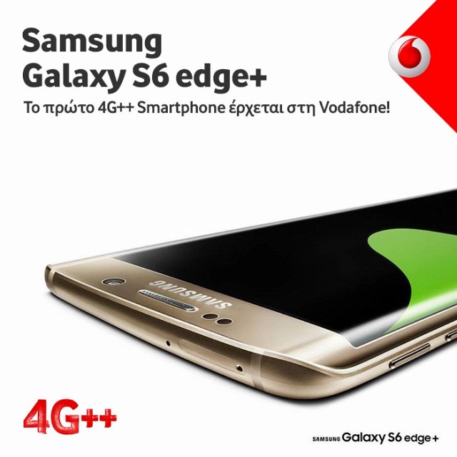 Το πρώτο 4G++ Smartphone έρχεται στη Vodafone στις 4 Σεπτεμβρίου και φέρει το όνομα Samsung Galaxy S6 edge+. Πρόκειται για το πρώτο CAT9 smartphone με καινοτόμα χαρακτηριστικά που θα εντυπωσιάσουν. Θα κυκλοφορήσει σε δυο χρώματα, μαύρο και χρυσό και θα έχει χωρητικότητα 32GB.