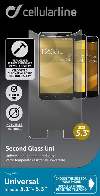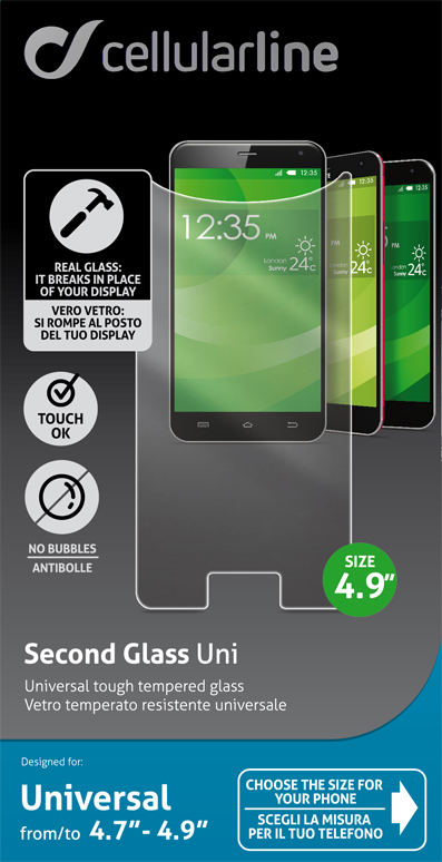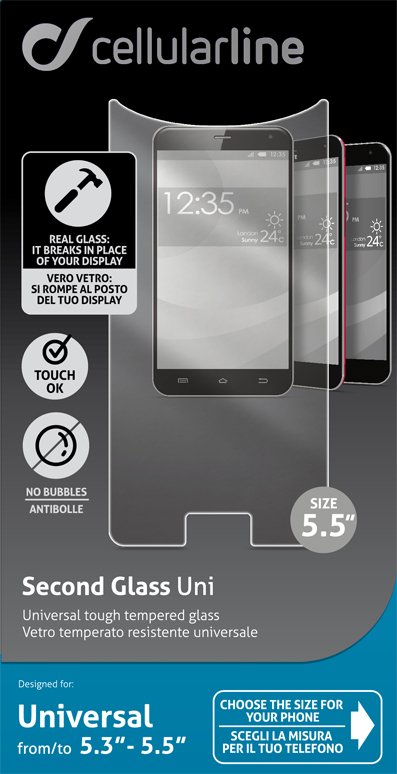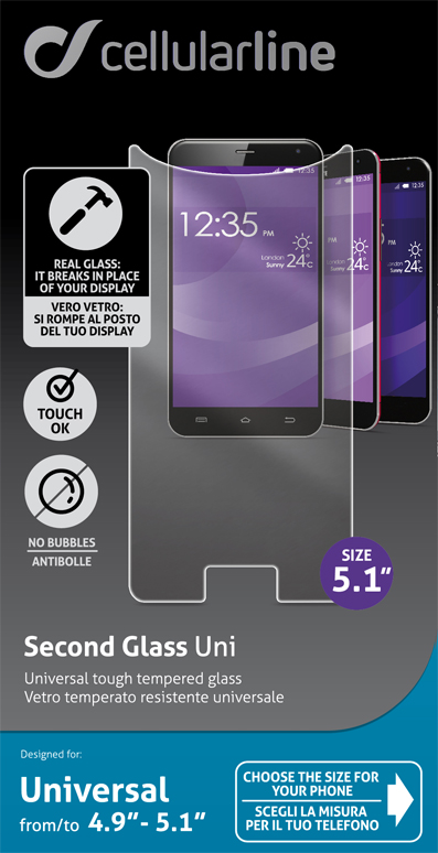 Τα νέα Universal Second Glass από τη Cellular Line από πραγματικό γυαλί προστατεύουν την οθόνη του κινητού σας, με τον καλύτερο δυνατό τρόπο διατηρώντας την αίσθηση της αφής και της φωτεινότητας αναλλοίωτη. Όντας γυαλί δεν δημιουργεί φυσαλίδες κατά την εφαρμογή. Χάρη στο σχεδιασμό που έχουν, προσαρμόζονται στις περισσότερες συσκευές της αγοράς καθώς δεν παρεμβαίνουν σε ηχείο, camera και κουμπιά.