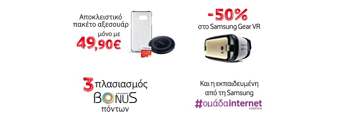 Οι πελάτες Vodafone θα έχουν τη δυνατότητα να προμηθευτούν ένα αποκλειστικό πακέτο Samsung αξεσουάρ που περιλαμβάνει ασύρματο φορτιστή, διάφανη θήκη και κάρτα μνήμης 64GB στη super τιμή των €49,90 καθώς και τη μάσκα εικονικής πραγματικότητας Samsung Gear VR αξίας €99,90 με έκπτωση 50%.